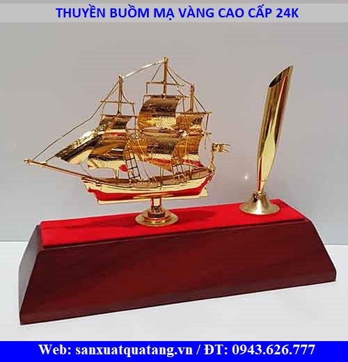 Cắm bút để bàn thuận buồm xuôi gió, thuyền buồm dát vàng quà tặng.