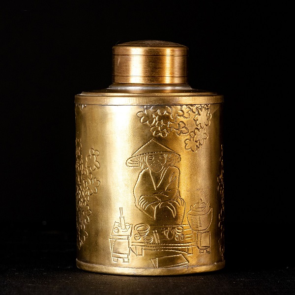 Một chiếc hộp đựng chè được đúc bằng đồng nguyên khối, chạm khắc tinh xảo họa tiết chìm trên mặt hộp với bức tranh bà cụ bán nước bên cạnh dàn hoa. Những họa tiết tinh tế mà gần gũi tạo nên sự tinh xảo ở chiếc hộp không còn chỉ là để đựng trà mà còn như là một vật trang trí để đặt trên bàn khách uống nước trong nhà.